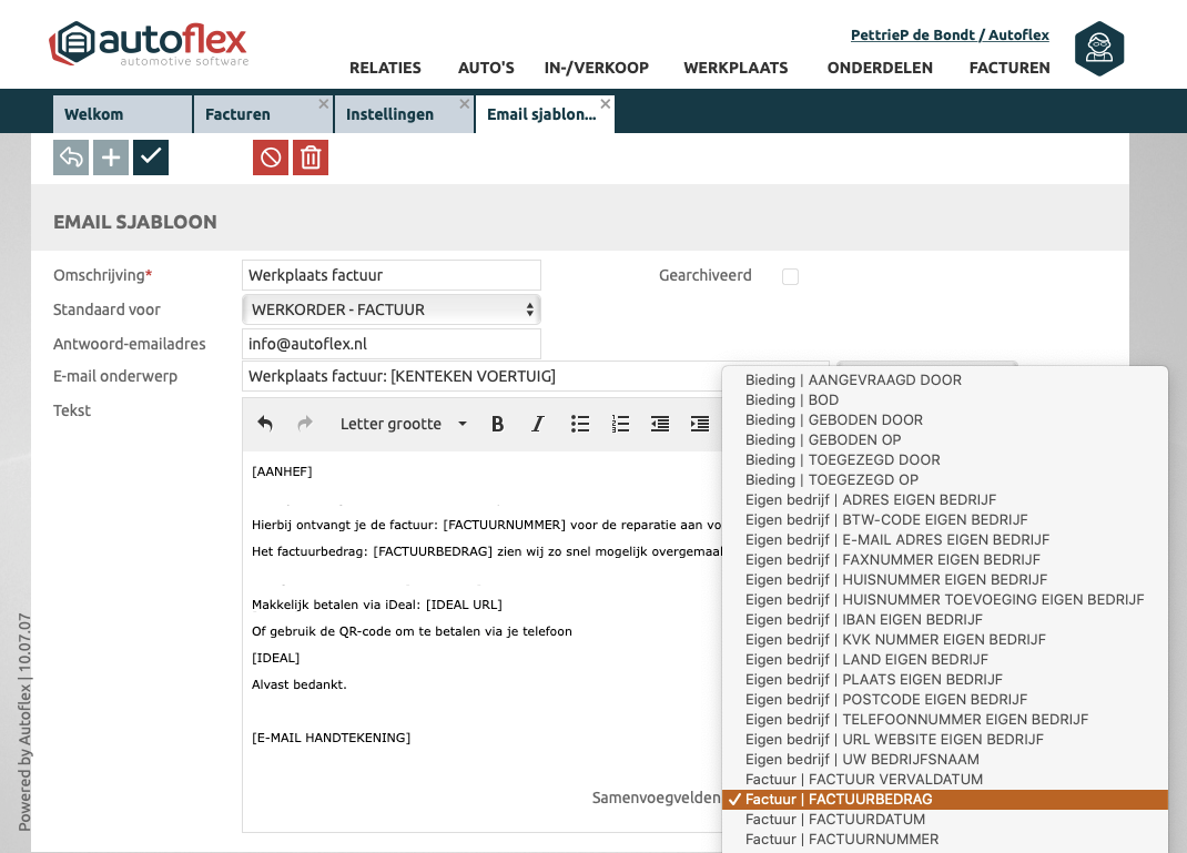 In Autoflex kun je gegevens van bijvoorbeeld een relatie, voertuig, factuur, automatisch laten invoegen in teksten. Hiervoor gebruik je samenvoegvelden.