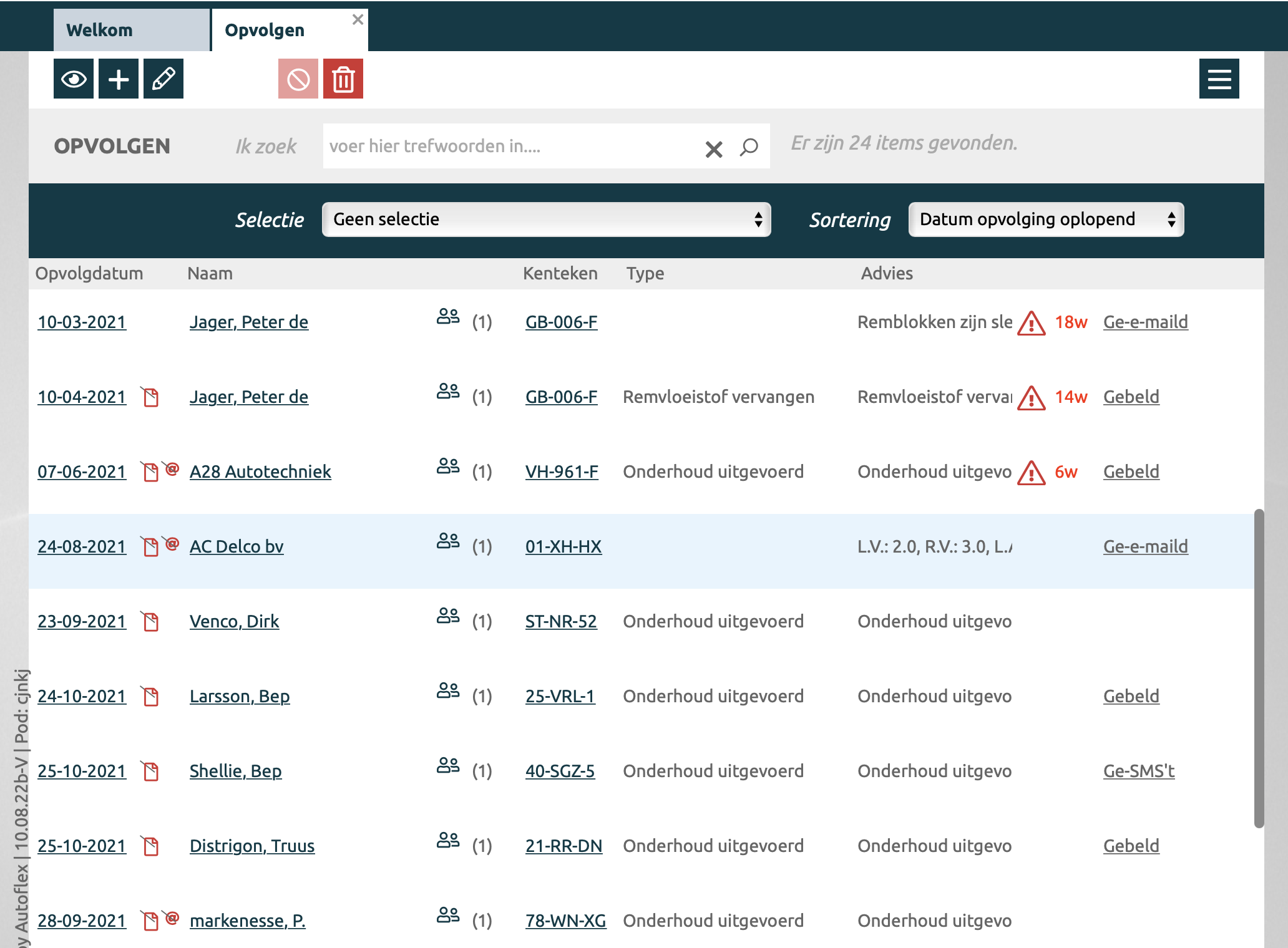 Daarnaast worden deze ook zichtbaar onder Relaties > Opvolgen. Hier zie je alle opvolgingen op opvolgdatum en kunt u meerdere selecties maken om de de lijst te specificeren.
