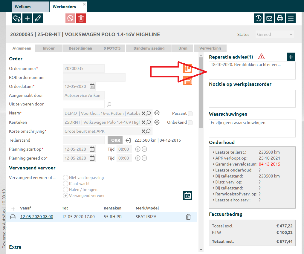 Reparatieadvies zichtbaar bij het voertuig |