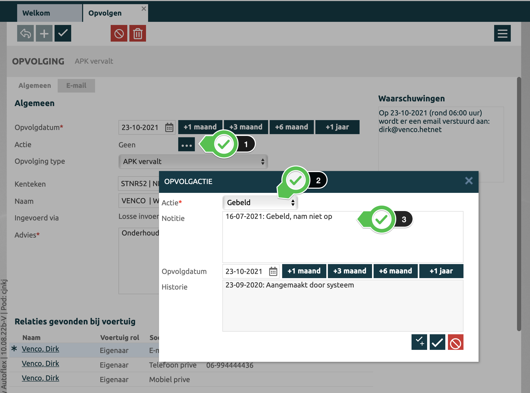 Er zijn meerdere triggers waarbij het systeem automatisch een opvolgactie maakt, indien een voertuig is geselecteerd in een werkorder en: