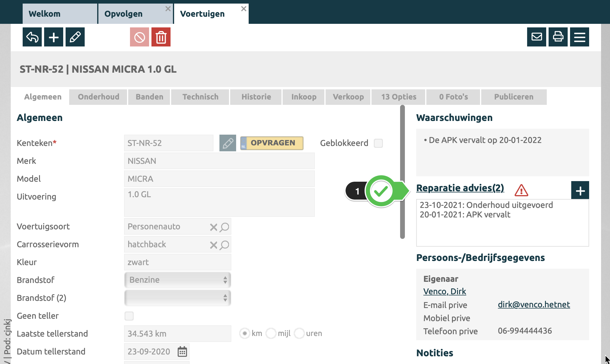 Volgend onderhoudsdatum is ingevoerd en de datum is in de toekomst (en er is nog geen opvolgactie hiervoor aangemaakt).
