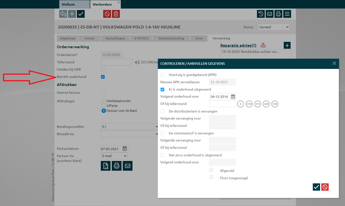 Reparatieadviezen is aangepast, het is nu mogelijk meer dan één advies per werkorder aan te maken. De reparatieadviezen zijn voorzien van een opvolgdatum. Via de CRM opvolging kunnen de adviezen worden opgevolgd. Reparatieadviezen zitten gekoppeld aan het kenteken. Bij het aanmaken van een nieuwe werkorder worden alle openstaande opvolg reparatieadviezen getoond.
