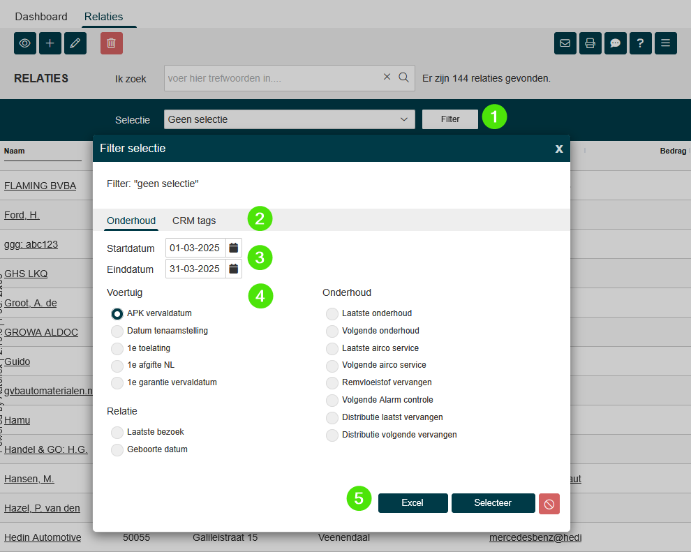 Je kan eerst ook een selectie of zoekopdracht doen om een voorselectie te maken in het relatieoverzicht. Daarna kun je nog verder verfijnen met het filter.