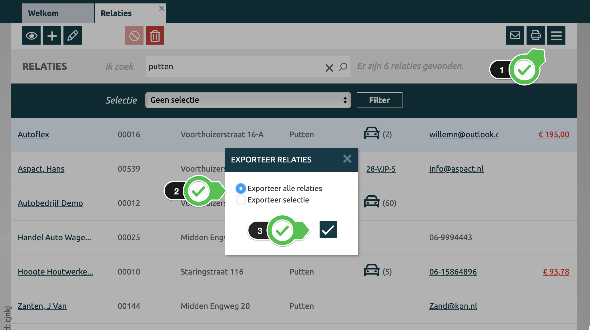 1. Exporteer alle relaties, om alle relaties in je Autoflex te exporeren