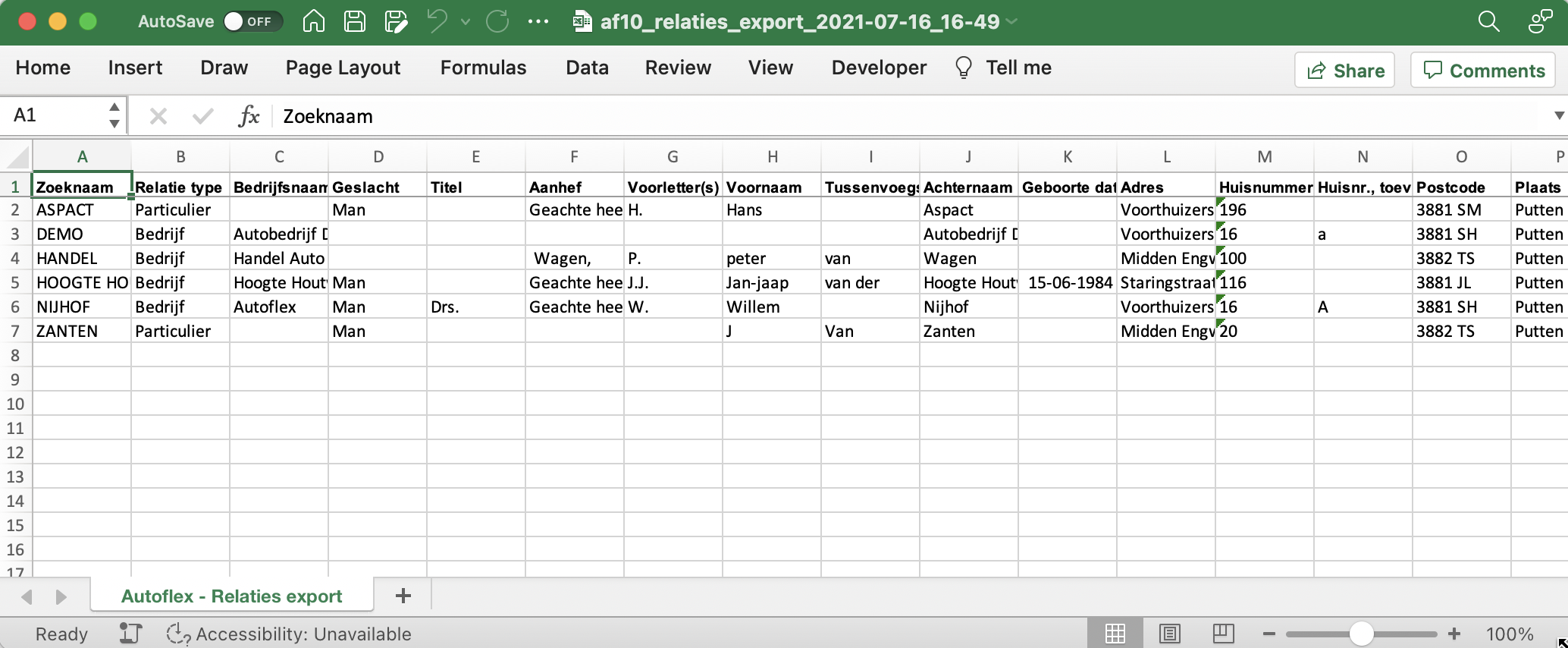 Een voorbeeld van een Relatie export in Excel