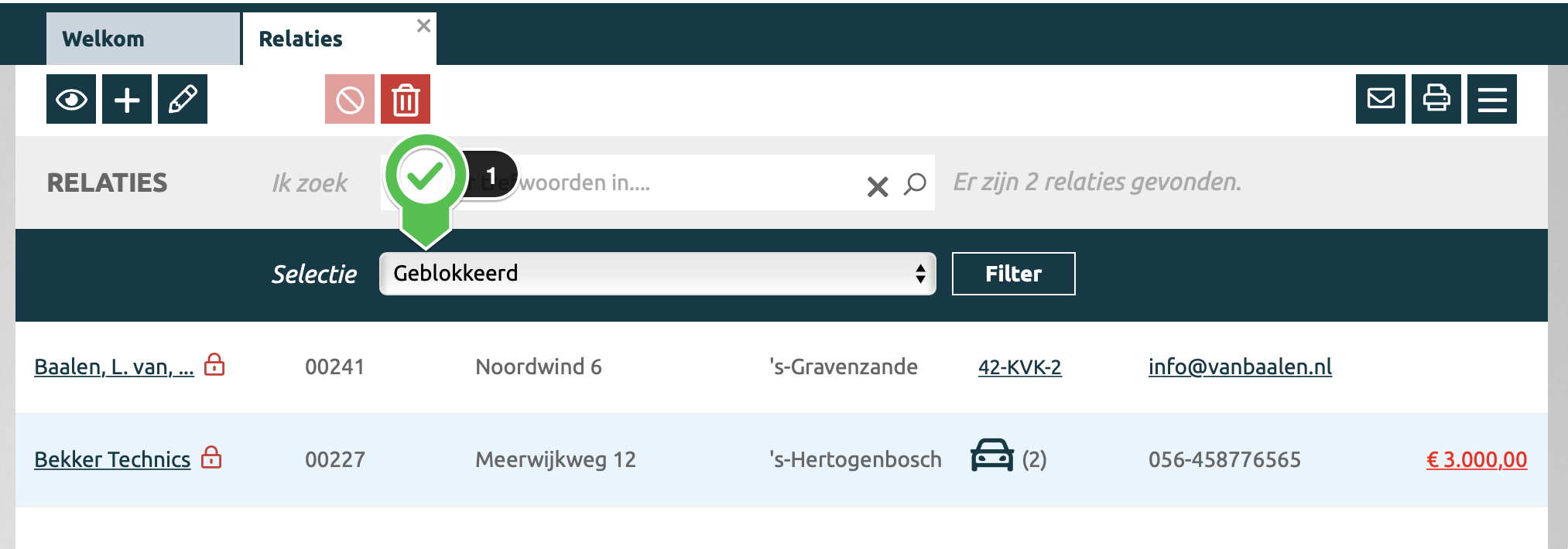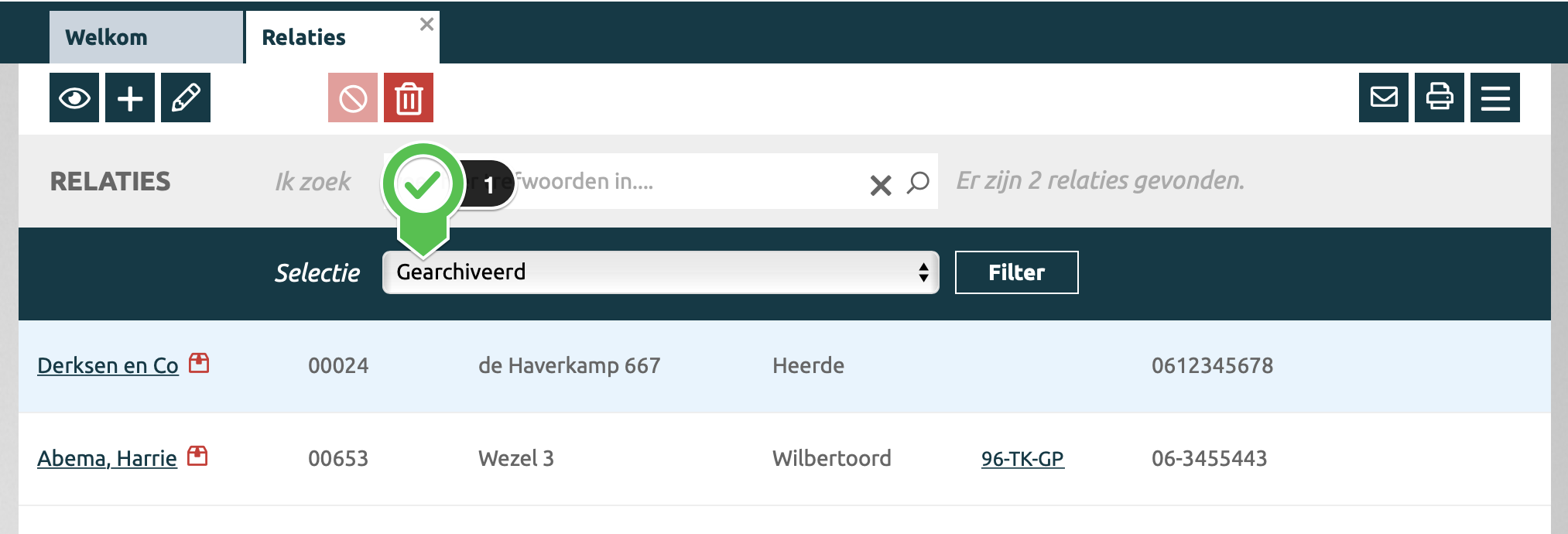 Gearchiveerde relaties worden voorzien van een '📦' slot verhuisdoos icoon