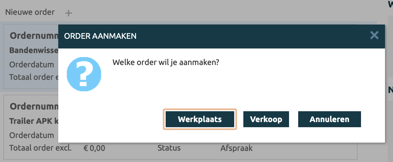 Werkplaats, een nieuwe werkplaats order aanmaken voor deze relatie