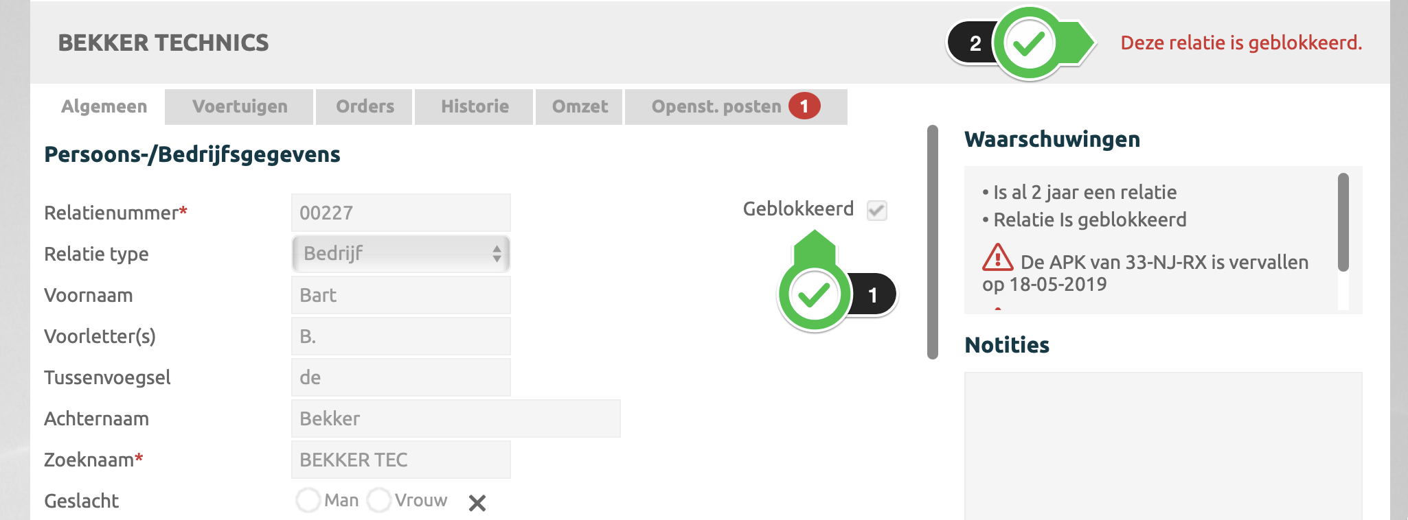 Hier worden de waarschuwingen over de klant, hoe lang is de klant al relatie en ook de waarschuwingen over de gekoppelde voertuigen getoondNotities