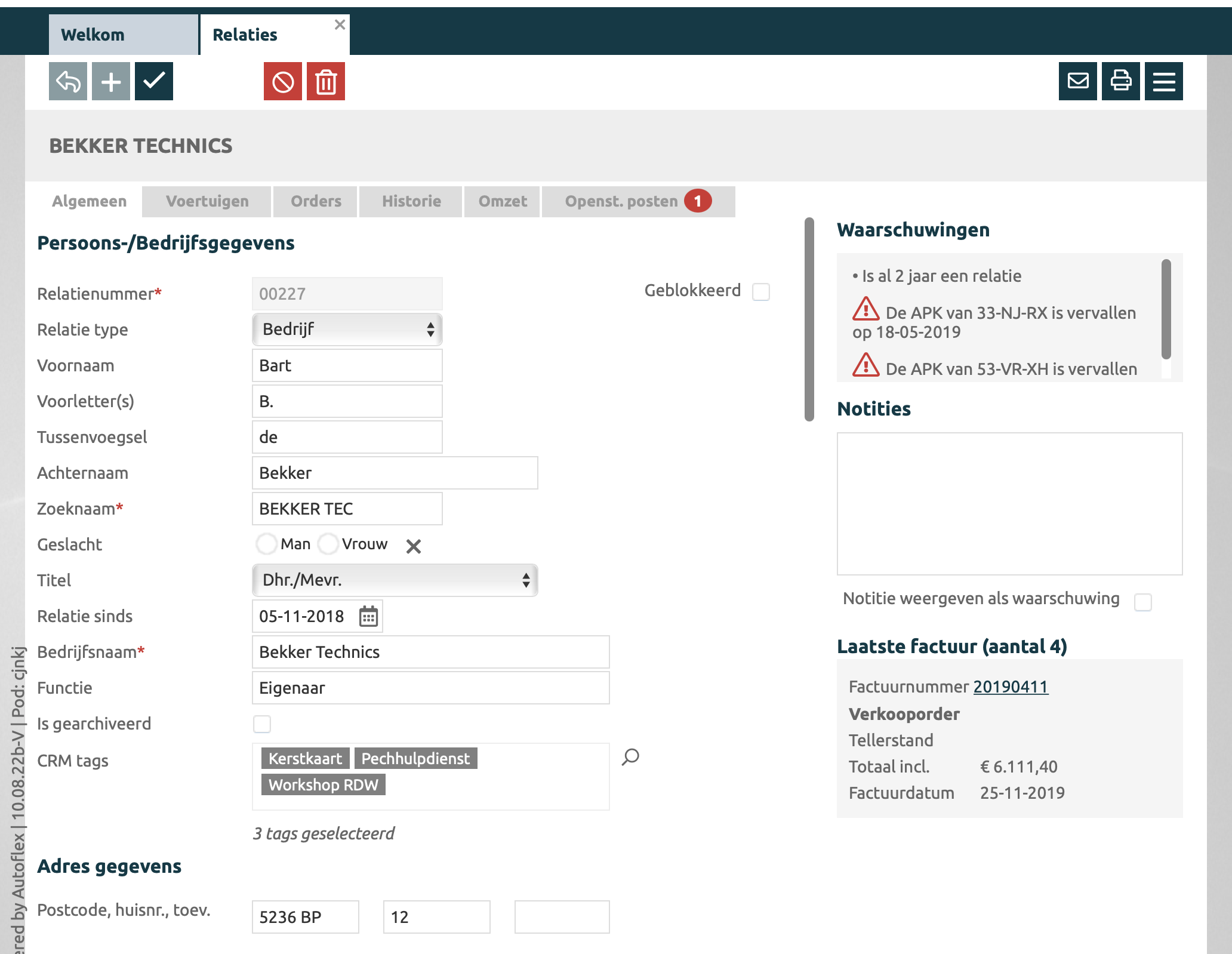 Overzicht van de openstaande posten op deze relatie. De openstaande posten worden via het gekoppelde boekhoudpakket ingelezen in Autoflex Zodra er één of meerdere openstaande posten zijn dan wordt dit duidelijk getoond met het rode nummer in het tabblad, zoals hierboven met de rode cijfer 1. |