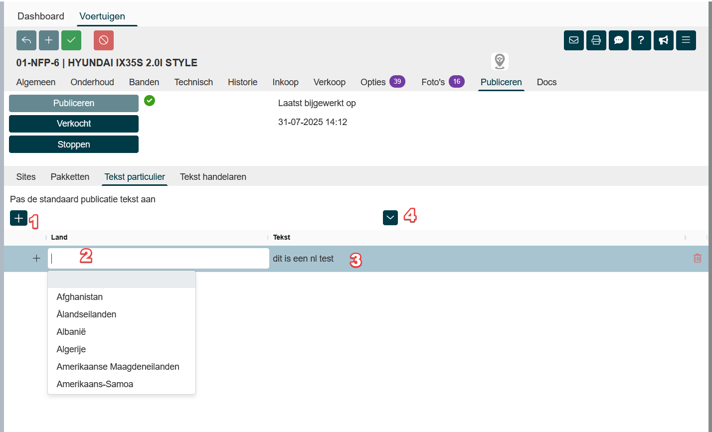 Hier kun je teksten aanmaken die bij dit voertuig getoond worden. In het ene tabblad de tekst voor particulieren en in het andere tabblad de tekst voor handelaren.