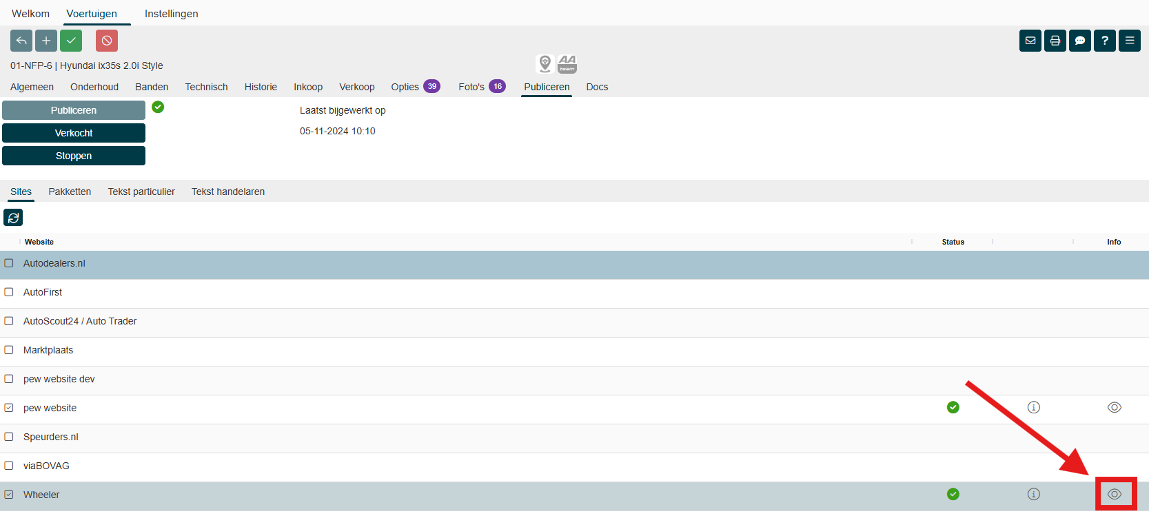 Druk op de knop Publiceren voor de laatste stap. De pijltjes gaan draaien totdat de voertuig online staat. Er verschijnt een groen bolletje als het publiceren geslaagd is. | Per site zie je aan het (groene) bolletje of de advertentie is geplaatst. Met je muis op de i zie je dat ook. Klik op het oogje om de advertentie te bekijken. |