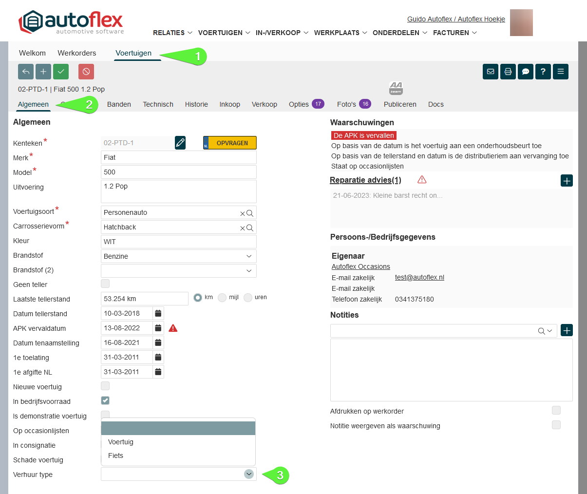 Je kunt voor elke leenfiets een 'voertuig' aanmaken. Kies hierbij als kenteken bijvoorbeeld FIETS01' en bij verhuurtype geef je aan dat het een fiets is. De fiets wordt nu op de juiste manier getoond in het overzicht.