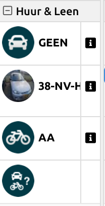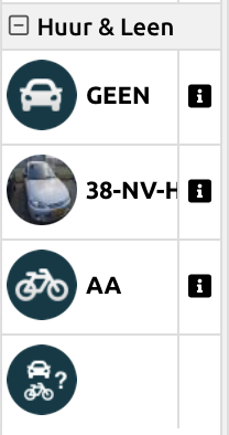 F: Huur en leen Overzicht van de Huur & Leen voertuigen De Voertuigen worden gesorteerd per categorie, eerst de auto’s en daarna de fietsen Het laatste icon is voor een onbekende Huur & Leen voertuig |