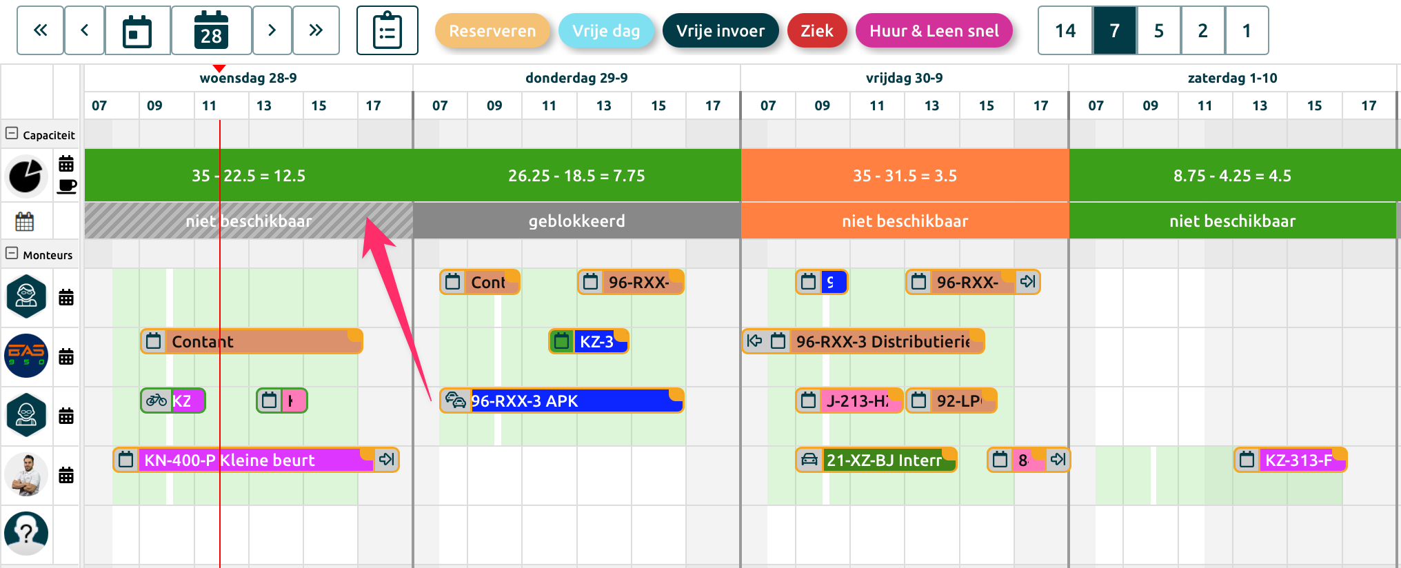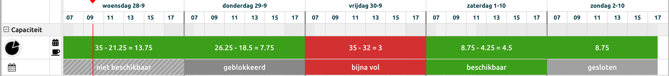 De capaciteit wordt in kleuren: groen, oranje, rood, en grijs weergegeven ook wordt in de balk het aantal beschikbare uren en en uren die over zijn op deze dag aangegeven.