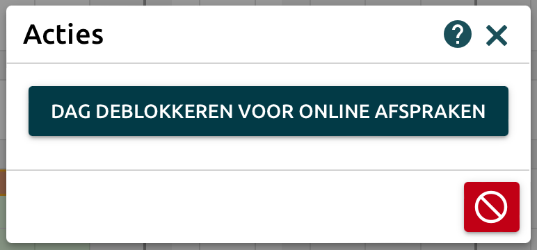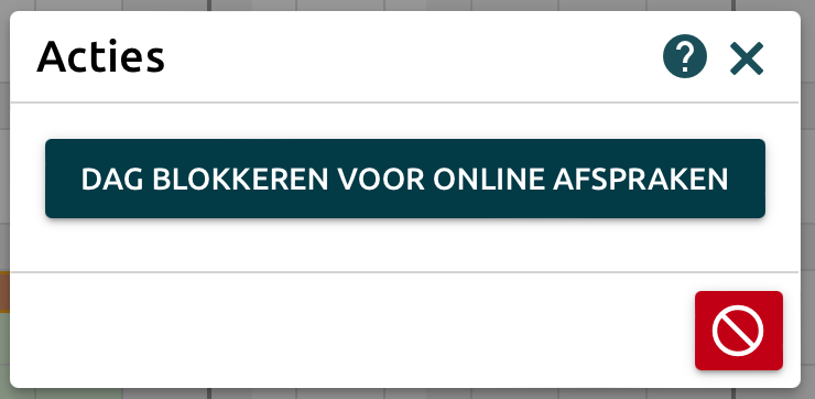 Om een dag te blokkeren klok op het capaciteitsblok van deze dag, in het dialoog kies nu: Dag blokkeren voor online afspraken. Deze dag is nu geblokkeerd voor de Online Afspraken. |