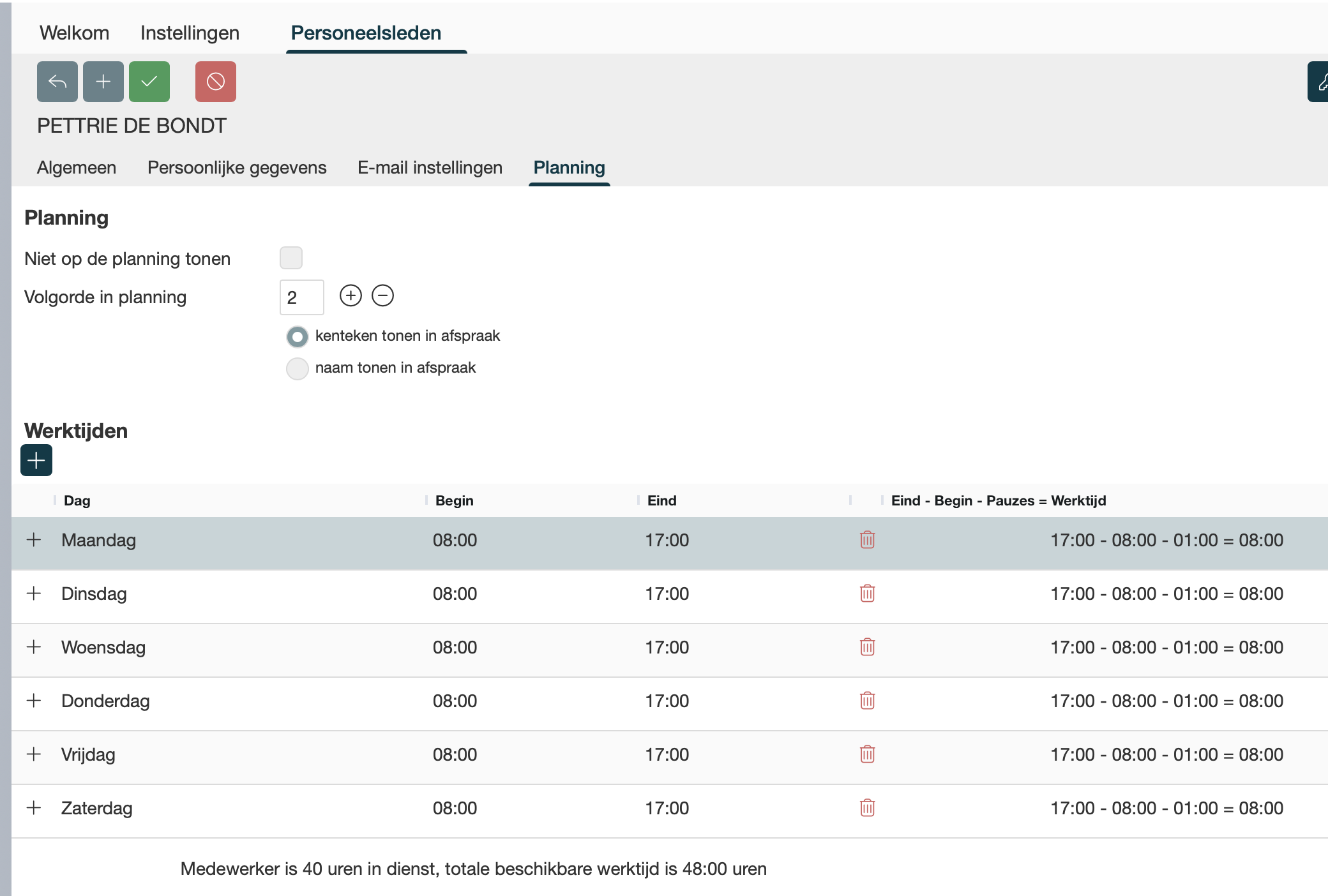 Deze instellingen kunnen via Instellingen → Personeelsleden → tabblad Planning worden gewijzigd.