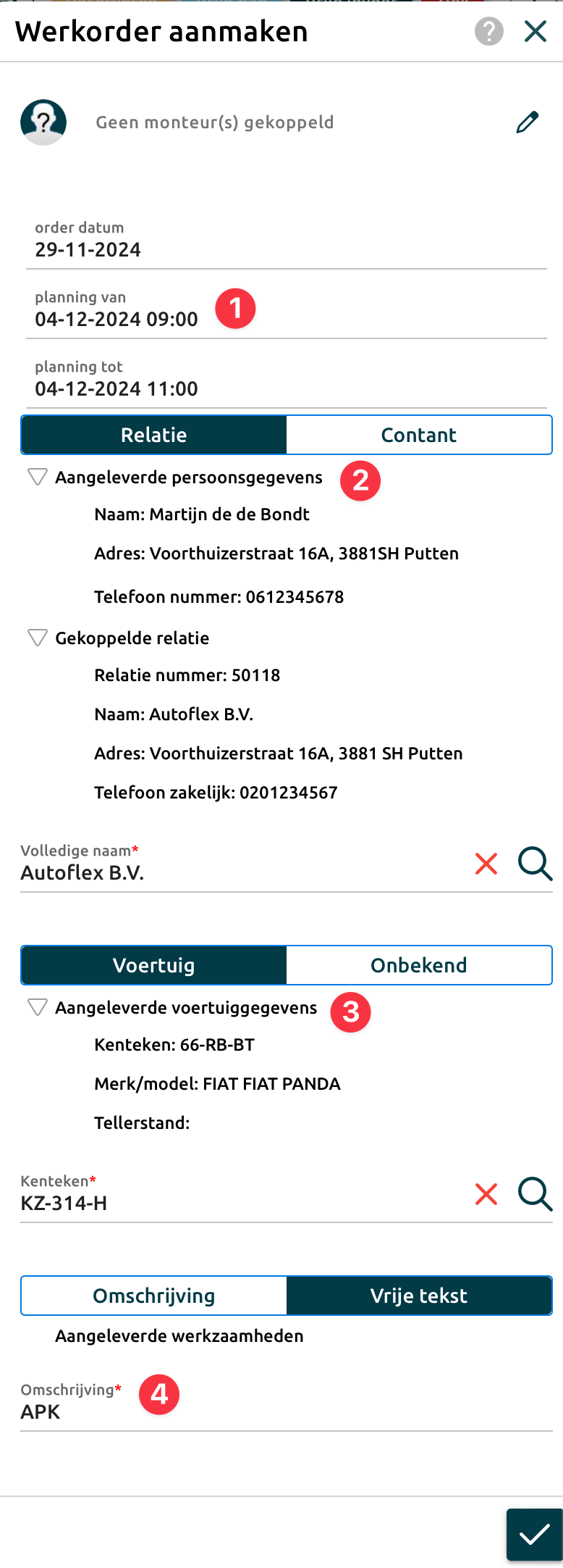 De werkorder wizard zal een aantal extra gegevens tonen die vanuit de afspraak naar voren zijn gekomen. Dit helpt om met de correcte gegevens een goed ingevulde werkorder te maken:
