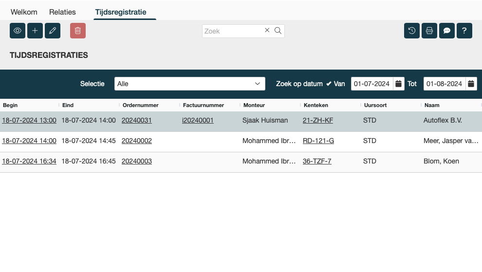 Het overzicht van de Tijdsregistraties, hier worden alle geregistreerde tijden getoond.