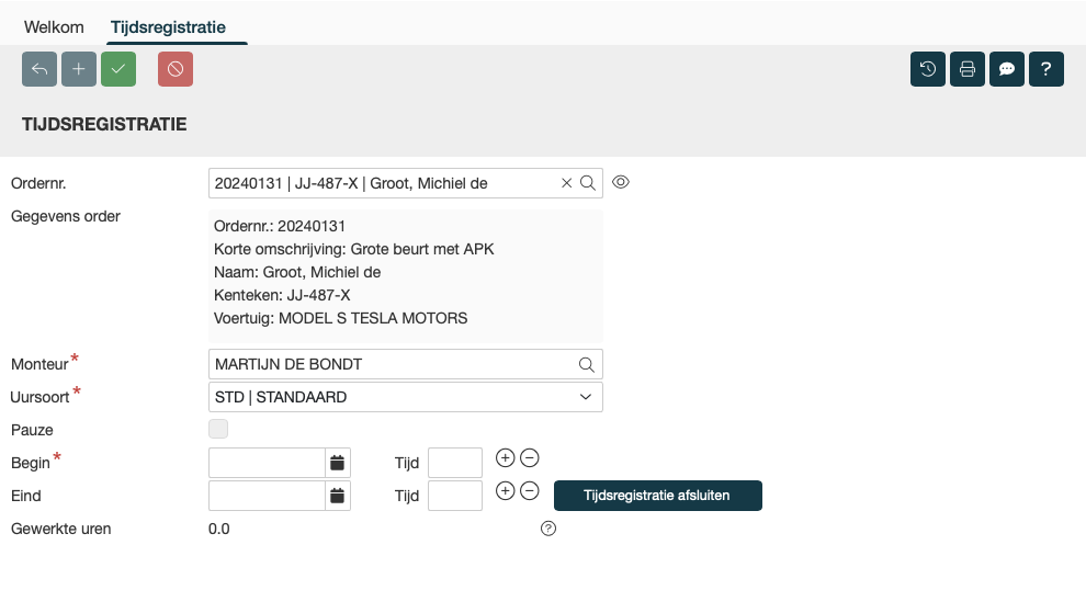Tijdregistratie afsluiten, deze knop is zichtbaar als er nog geen eind datum/tijd is ingevuld