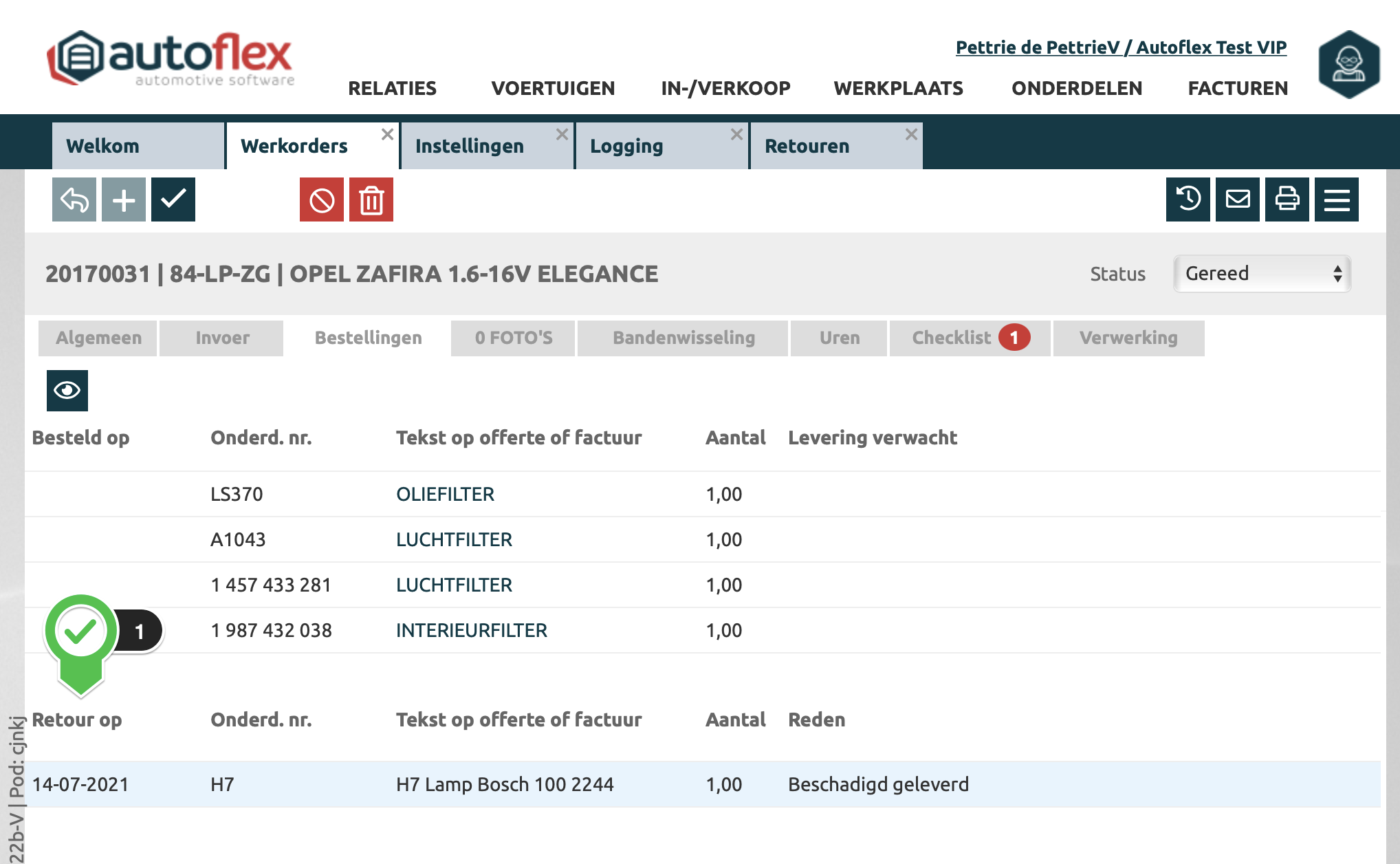 De onderdelen die besteld zijn bij de grossier(s) bij de invoer van de werkorder, staan in het bestelling overzicht getoond. In het overzicht worden ook de retouren getoond.