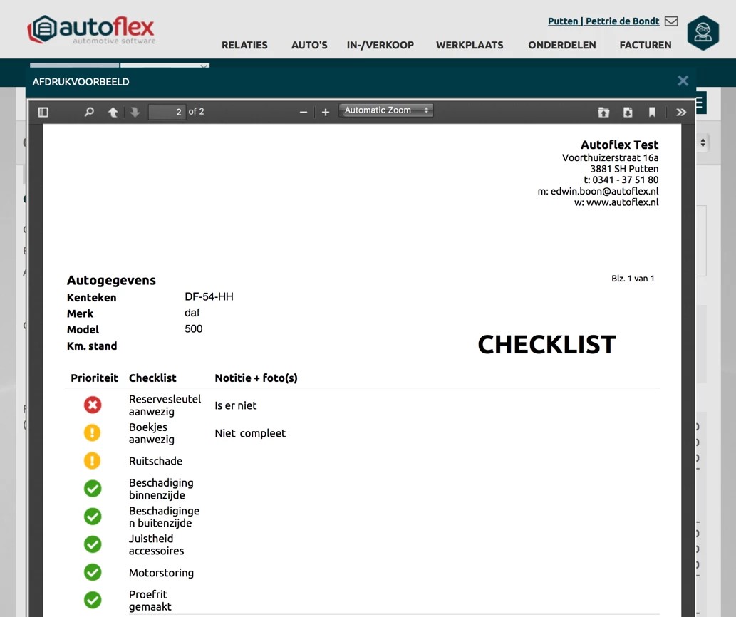 Je kunt de checklist voor intern gebruik gebruiken om te controleren of alle onderdelen van het voertuig zijn gecontroleerd. Je kan de checklist ook zeker gebruiken om mee te geven aan de klant, om zo te laten zien wat er allemaal gecontroleerd is en wat eventueel aandacht nodig heeft in de toekomst (oranje) of zaken die direct aangepakt moeten worden (rood).