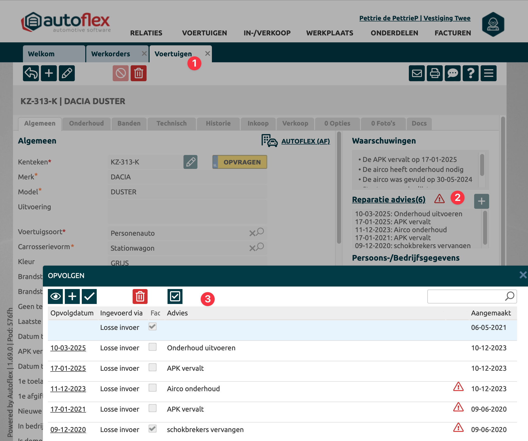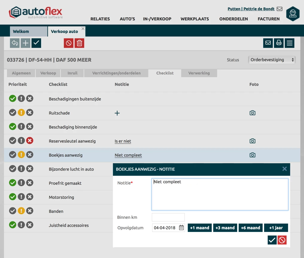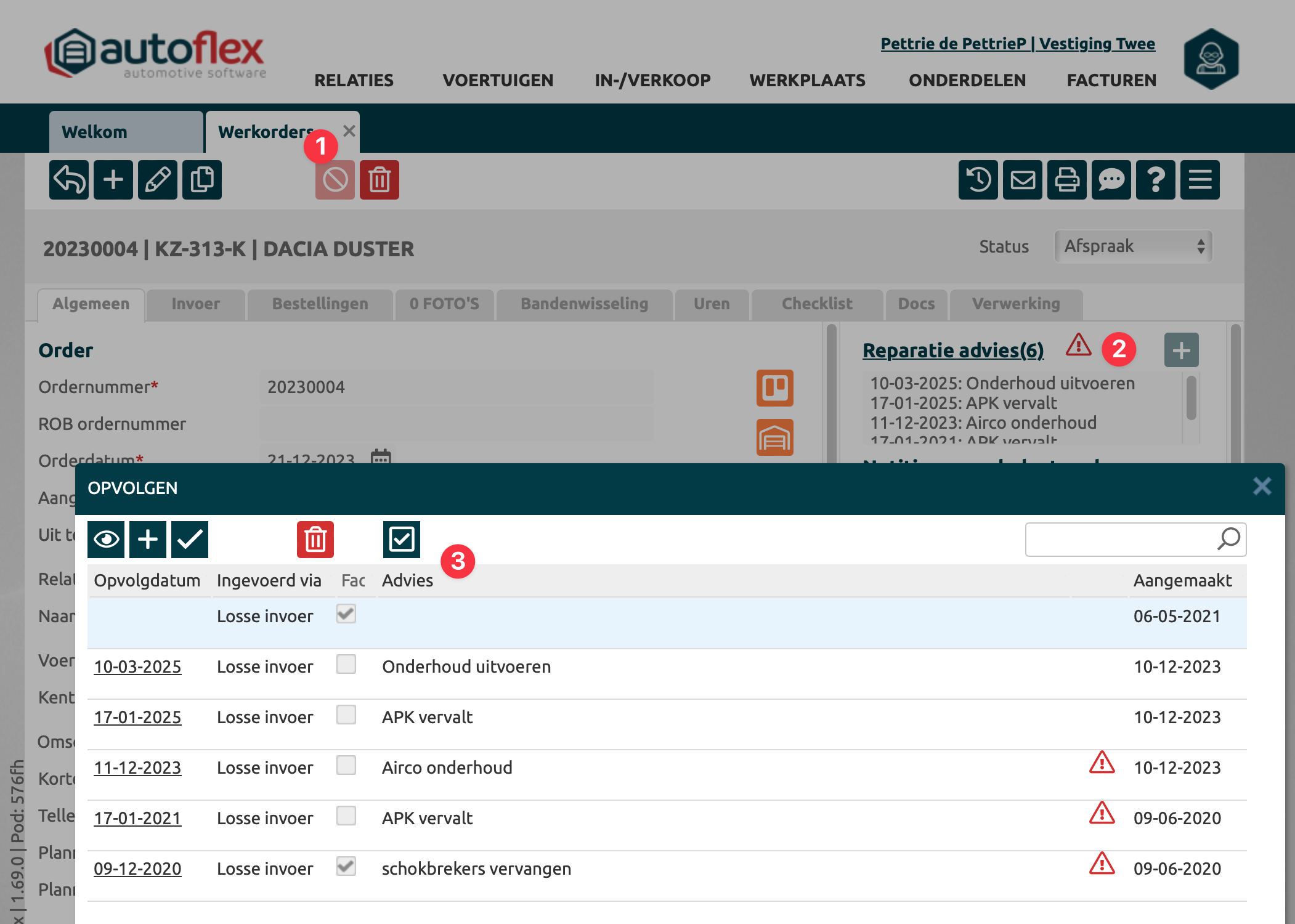 Als er een oranje checklist item is aangevinkt en de order is verwerkt naar factuur, dan wordt er van dit item een reparatie-advies aangemaakt. Dit betekend dat bij dit voortuig een advies is aangemaakt die altijd weer duidelijk terug te vinden is. Op deze manier kun je duidelijk en overzichtelijk bijhouden wat de volgende actie punten zjin bij dit voertuig. Via opvolgen kun je deze reparatie-adviezen in de tijd bijhouden en tijdig de klant informeren voor reparaties.