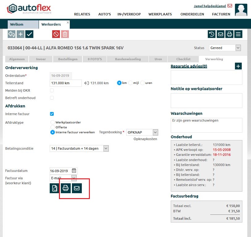 Nadat alle gegevens zijn ingevoerd en gecontroleerd kun je de interne factuur verwerken door op het printer-icoon (of envelop-icoon voor versturen via e-mail) te klikken. |
