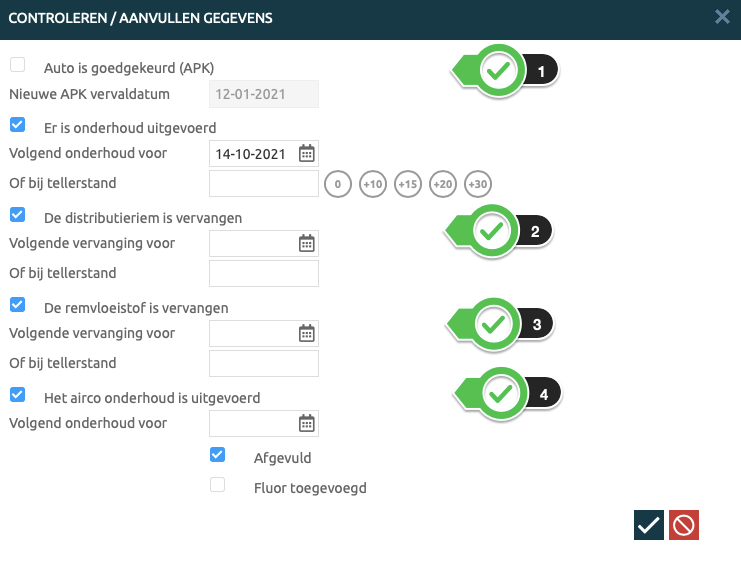 Aanvullende gegevens 1 t/m 4 1 = APK 2 = Distributieriem 3 = Remvloeistof 4 = Airco |