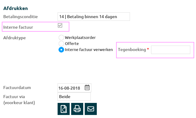 Maak een interne factuur via een werkorder en zet het vinkje interne factuur aan en geef de juiste grootboekrekening bij de tegenboeking.