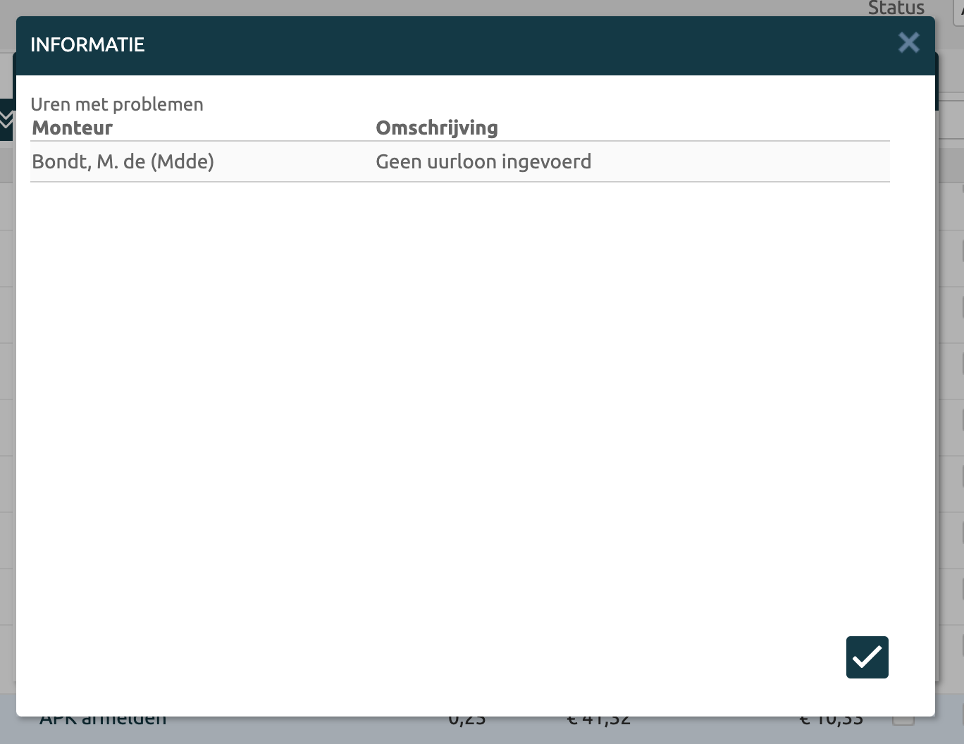 Als er wel uren zijn geklokt, maar er is voor die medewerker geen uurloon ingevoerd, dan geeft de marge berekening de volgende melding: Corrigeer bovenstaande fout door in het profiel van de medewerker uurloon op te geven |