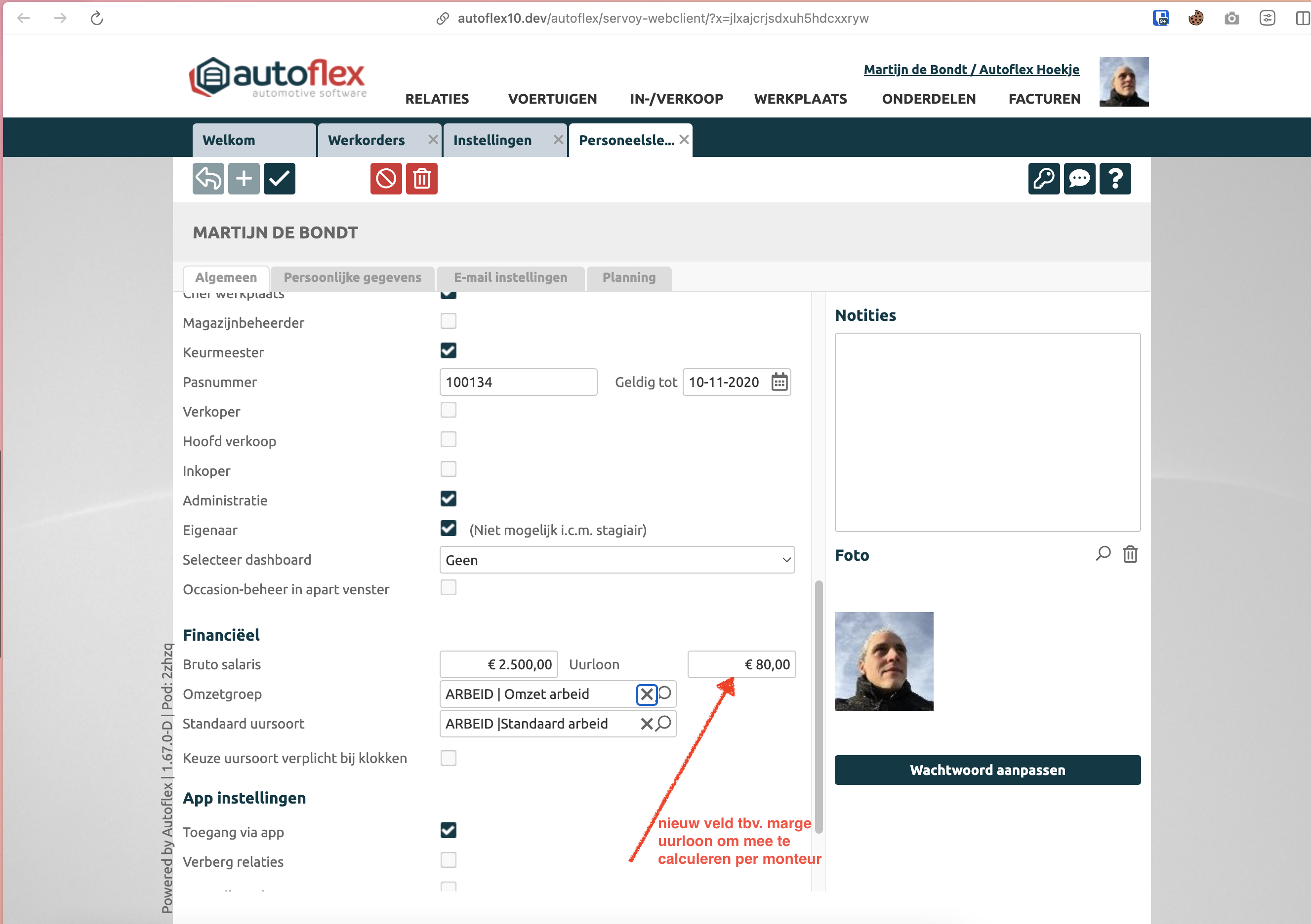 Om op basis van geklokte uren te calculeren moet eerst in het profiel van de monteur een kostprijs uurloon worden opgevoerd. (Profielfoto → Mijn Profiel → Financiëel)