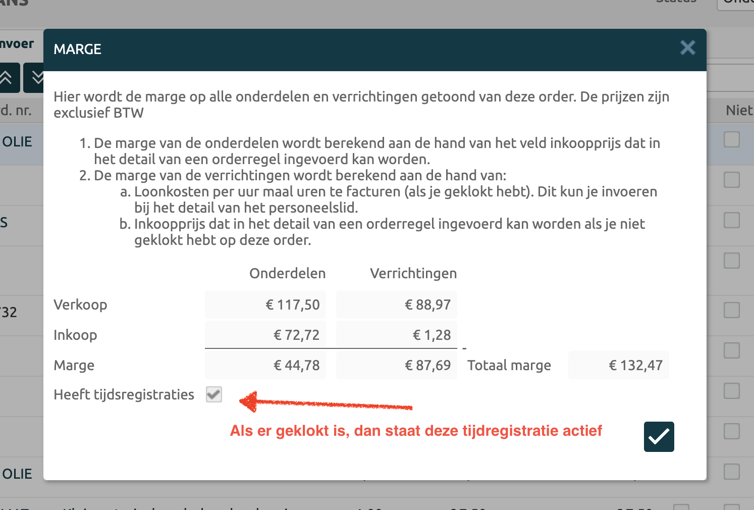 De knop toont een pop-up waarbij over de onderdelen en verrichtingen de marge wordt berekend tussen inkoop en verkoop. Hierdoor zie je wat je op de order verdient als winstmarge.