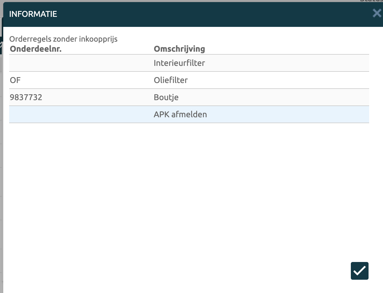 Zodra je het onderdeel opzoekt, de inkoopprijs opvoert, terugkeert naar de werkorder en klikt op de margeknop, dan zul je zien dat de ‘problemen’ voor dit onderdeel zijn opgelost.