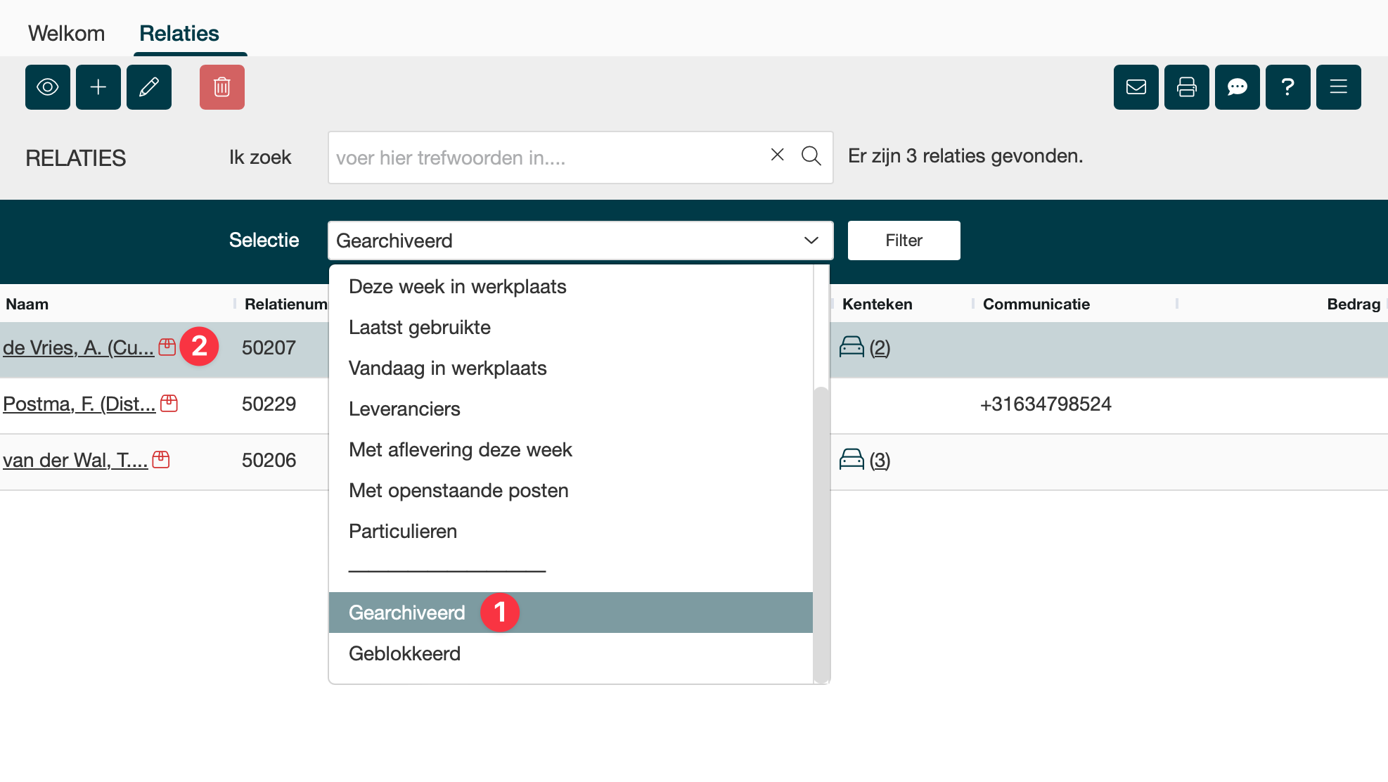 Archiveren | Het doel van archiveren is het opruimen van relaties die je niet meer wil gebruiken. Archiveren gaat een stap verder. De relatie is ook niet meer zichtbaar in het overzicht met relaties. In het overzicht bij de selectie: 'Gearchiveerd', is de enige plek waar je de relatie terug kunt vinden. |