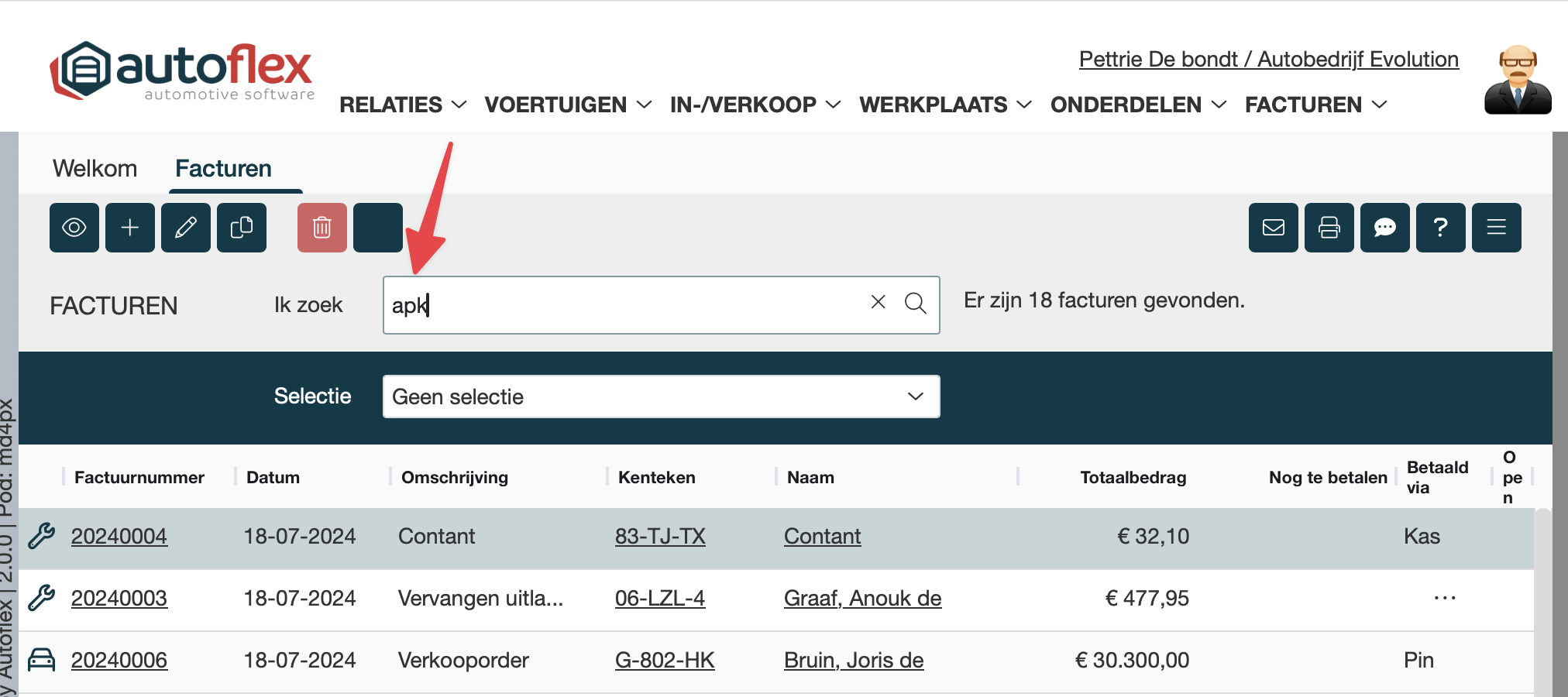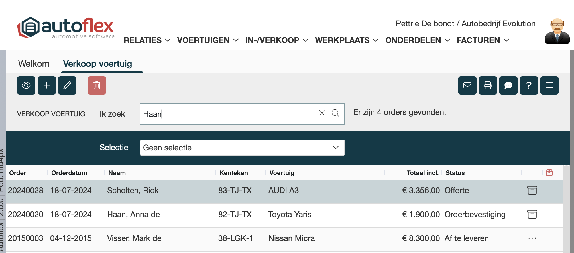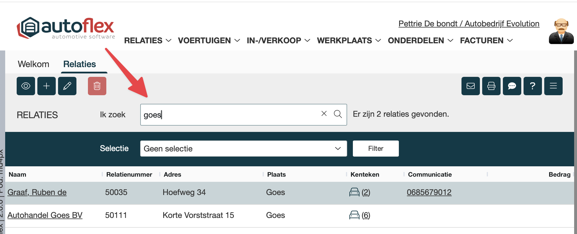 Handig is dat je niet hoeft te weten waar de informatie precies staat. Zoek je op kenteken? Dan krijg je het voertuig en de gekoppelde klant te zien. Zoek je op naam? Dan verschijnen direct de juiste relaties.