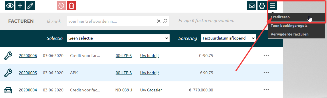| De geselecteerde factuur kun je crediteren via het menu rechtsboven. Let op! Je kunt niets aanpassen aan de factuur, de factuur wordt volledig gecrediteerd. |