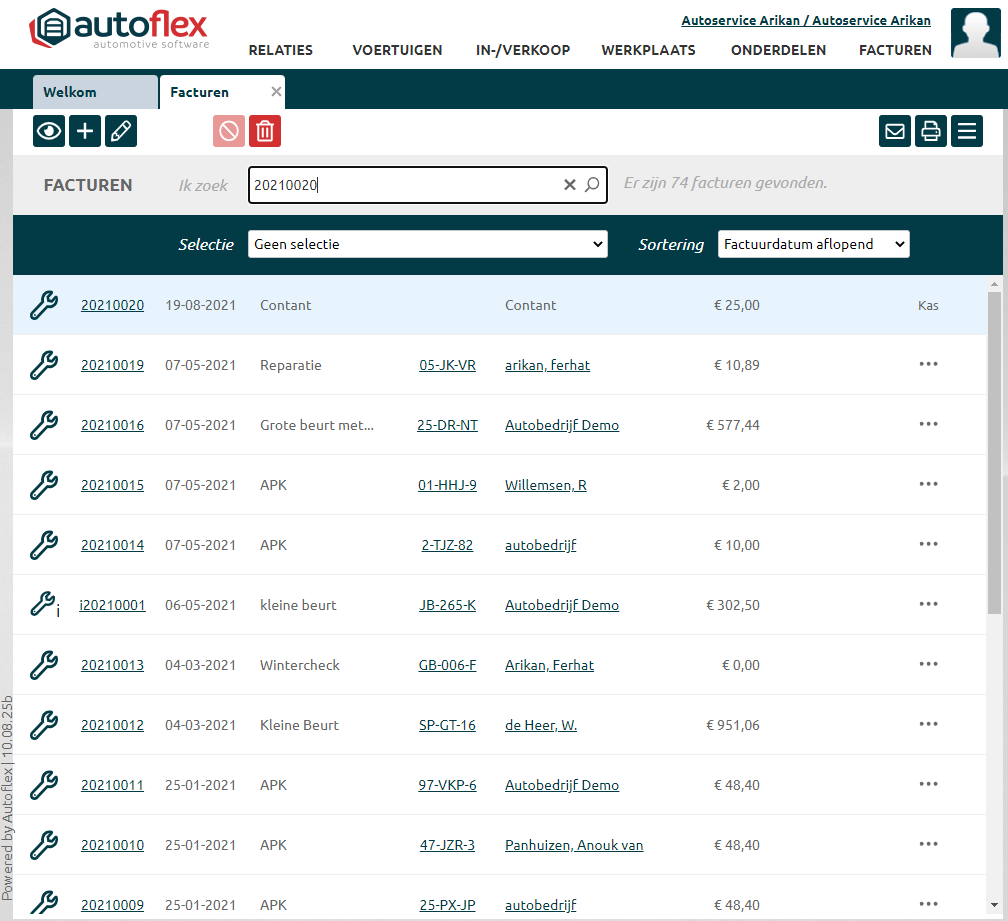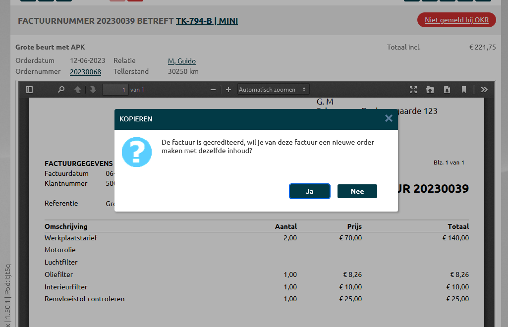 Dan kun je de factuur crediteren. Dit geldt voor werkplaats- én verkoopfacturen. Na het crediteren kan je een kopie maken van de order zodat je de order niet opnieuw hoeft aan te maken. De uren moeten wel opnieuw geklokt worden en onderdelen van grossiers hebben geen link meer met de grossier.