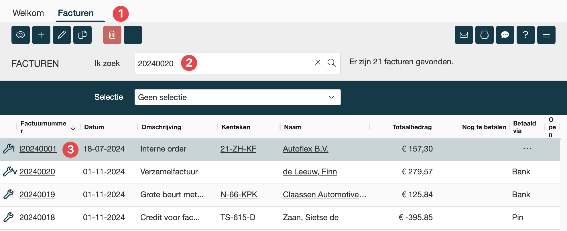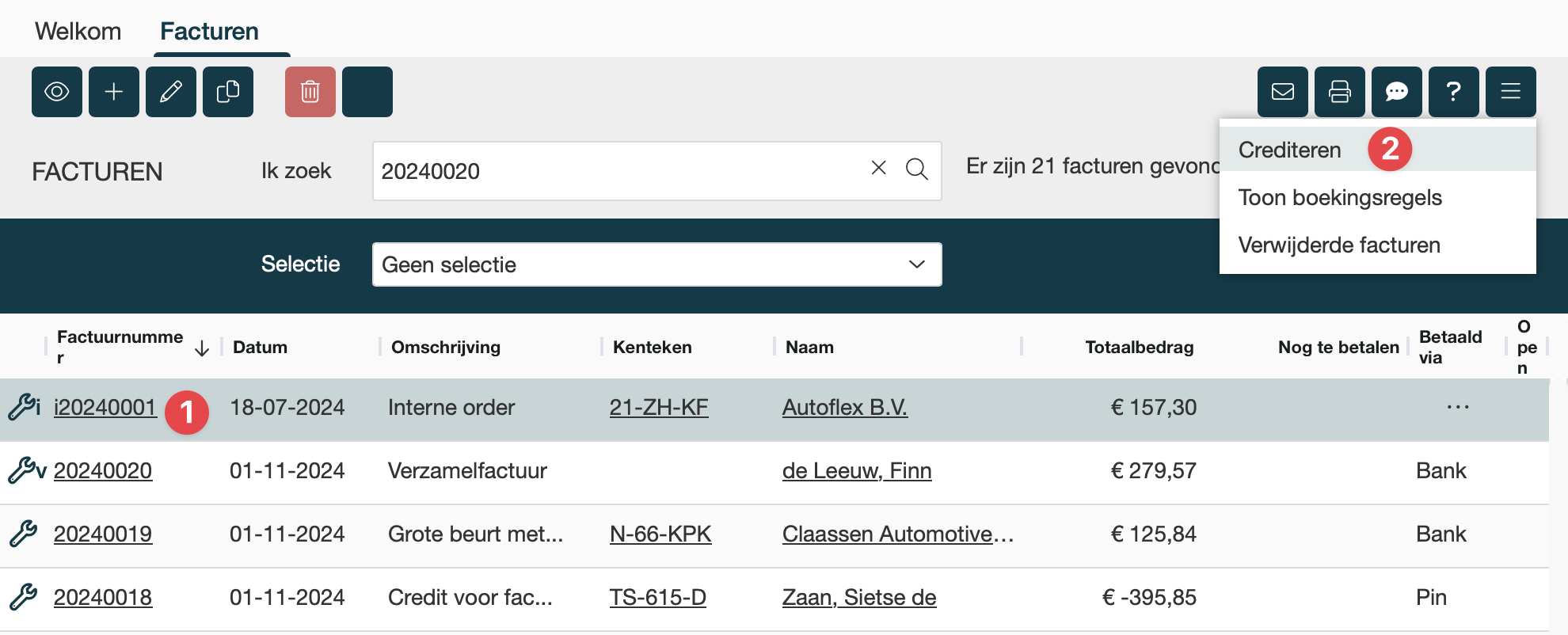 Nu zie je een overzicht van alle gemaakte facturen. Zoek en vind de factuur die je wilt crediteren.