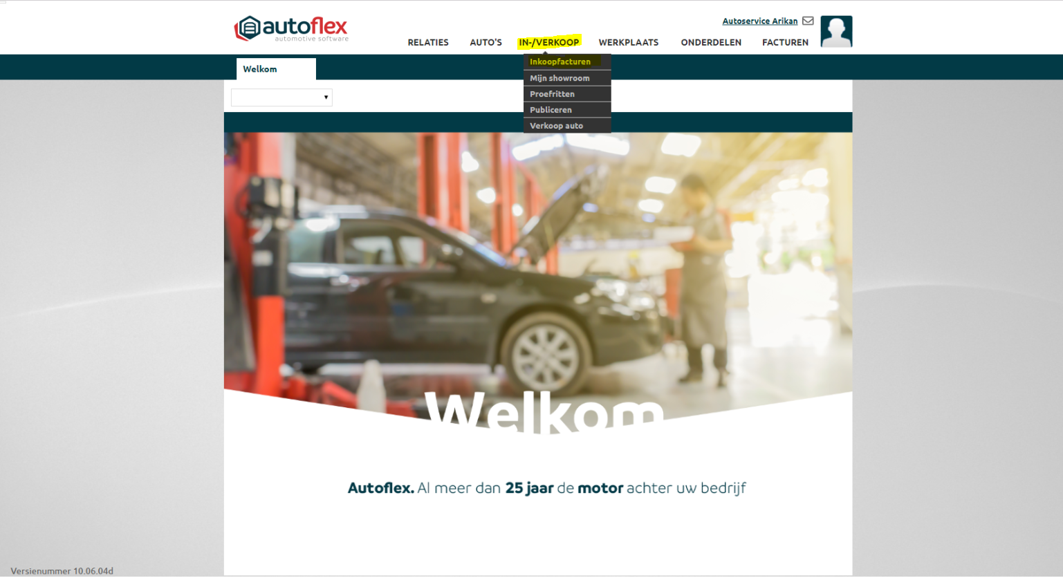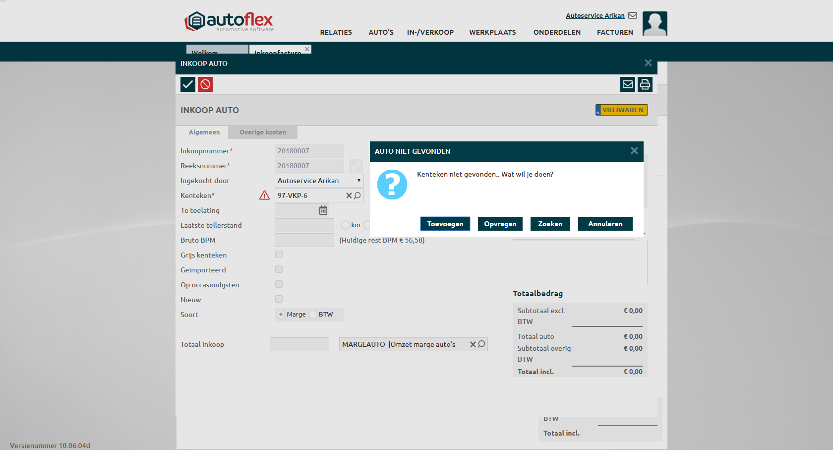 | Klik vervolgens op het tabblad 'inkoop' Klik nu op het icoontje voor de regel wordt een keuze dialoog getoond. Vul het kenteken in van het voertuig dat je wilt inkopen.
