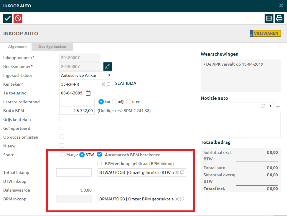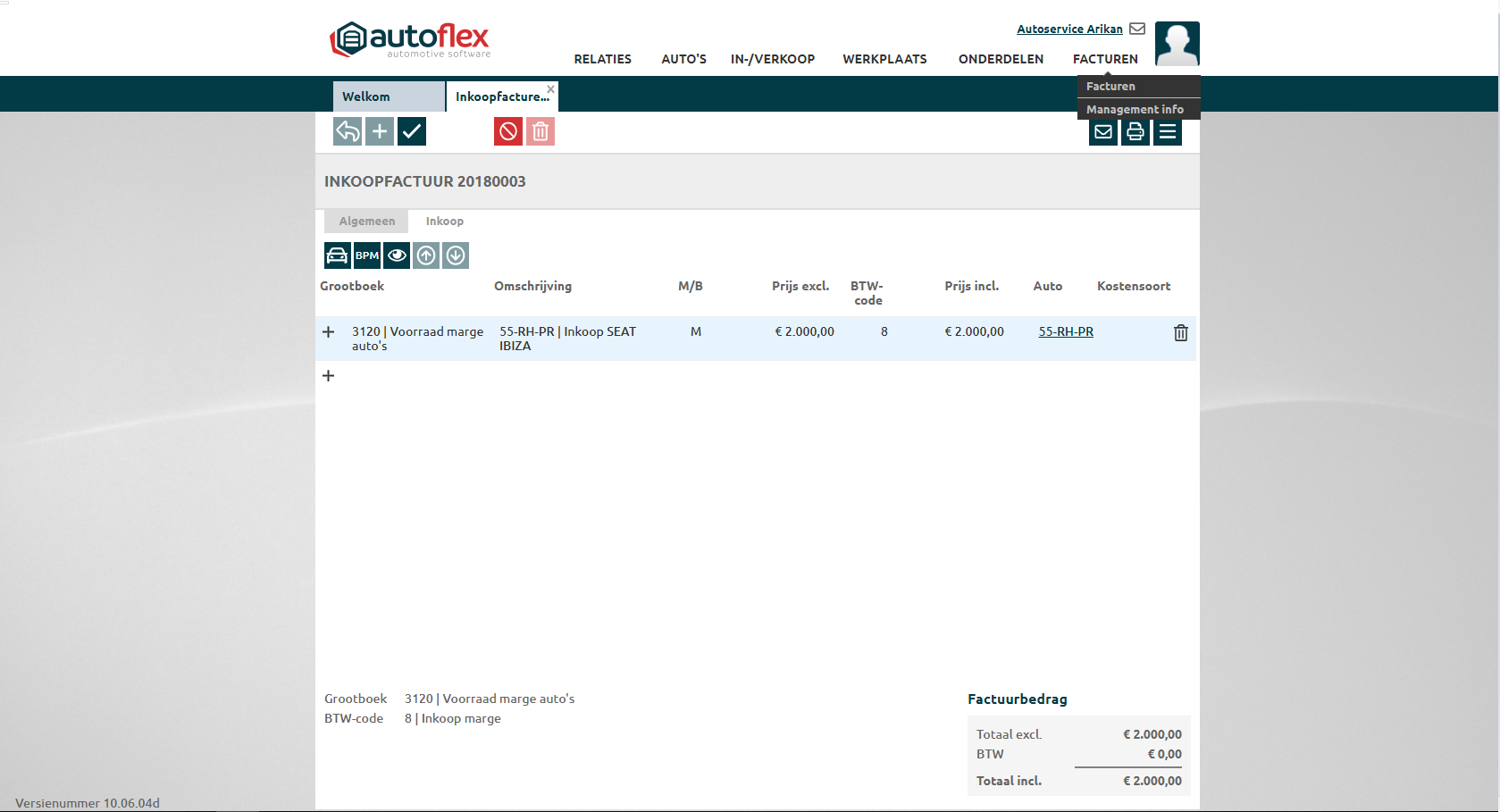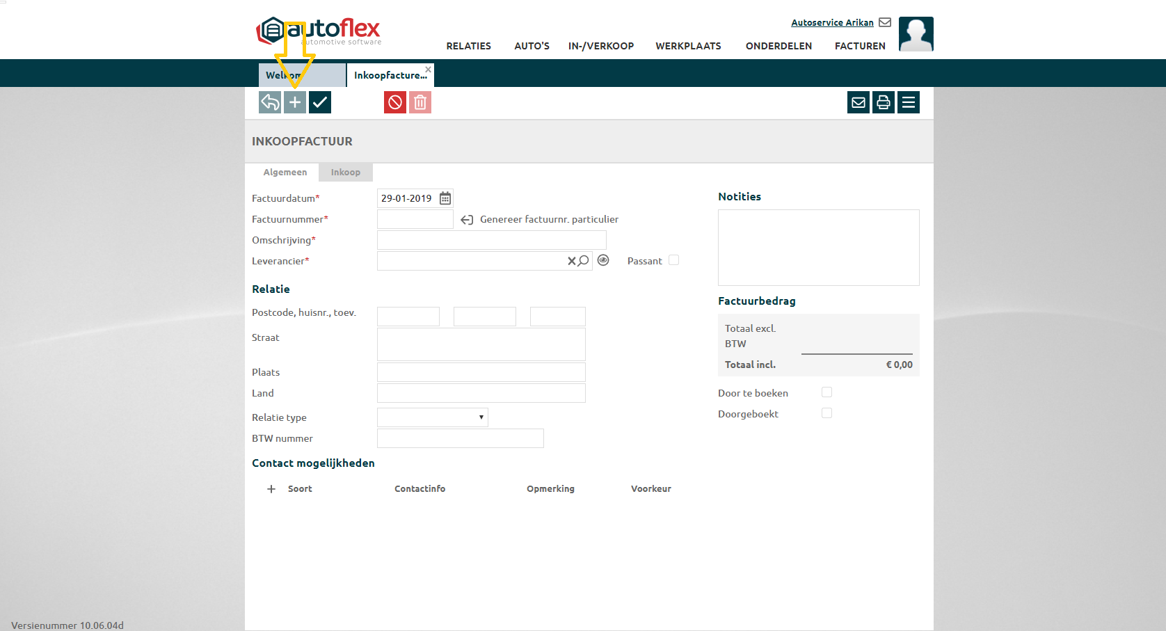 | Vul dit scherm zo veel mogelijk in. Alle velden met een * zijn verplichte velden. Factuurdatum: aan de hand van deze datum wordt de eventuele rest-bpm berekend Factuurnummer: dit is een verplicht veld. Als je een voertuig inkoopt van een particulier kun je een factuurnummer laten genereren. Dit nummer wordt ook gebruikt bij het doorboeken naar het gekoppelde boekhoudpakket Leverancier: als je hier de zoeknaam intypt kun je snel de relatie opzoeken. Uitgebreid zoeken kan via het vergrootglas .