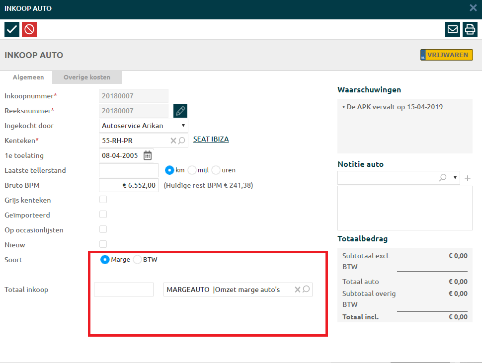 | Klik vervolgens op het tabblad 'inkoop' Klik nu op het icoontje voor de regel wordt een keuze dialoog getoond. Vul het kenteken in van het voertuig dat je wilt inkopen.