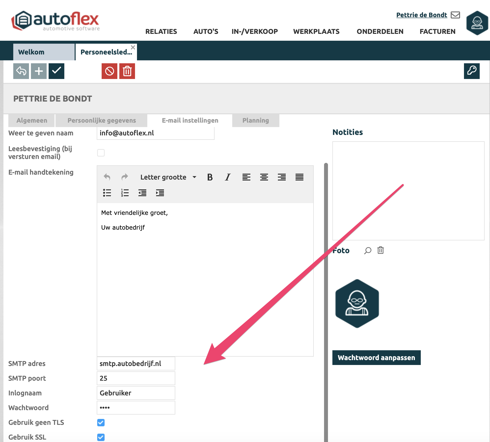 Kies je voor onze Sendgrid oplossing dan regelen wij de smtp gegevens voor je. Deze velden zie je dus ook niet bij het personeelslid. Alleen het emailadres, naam en de handtekening moet je zelf invullen.