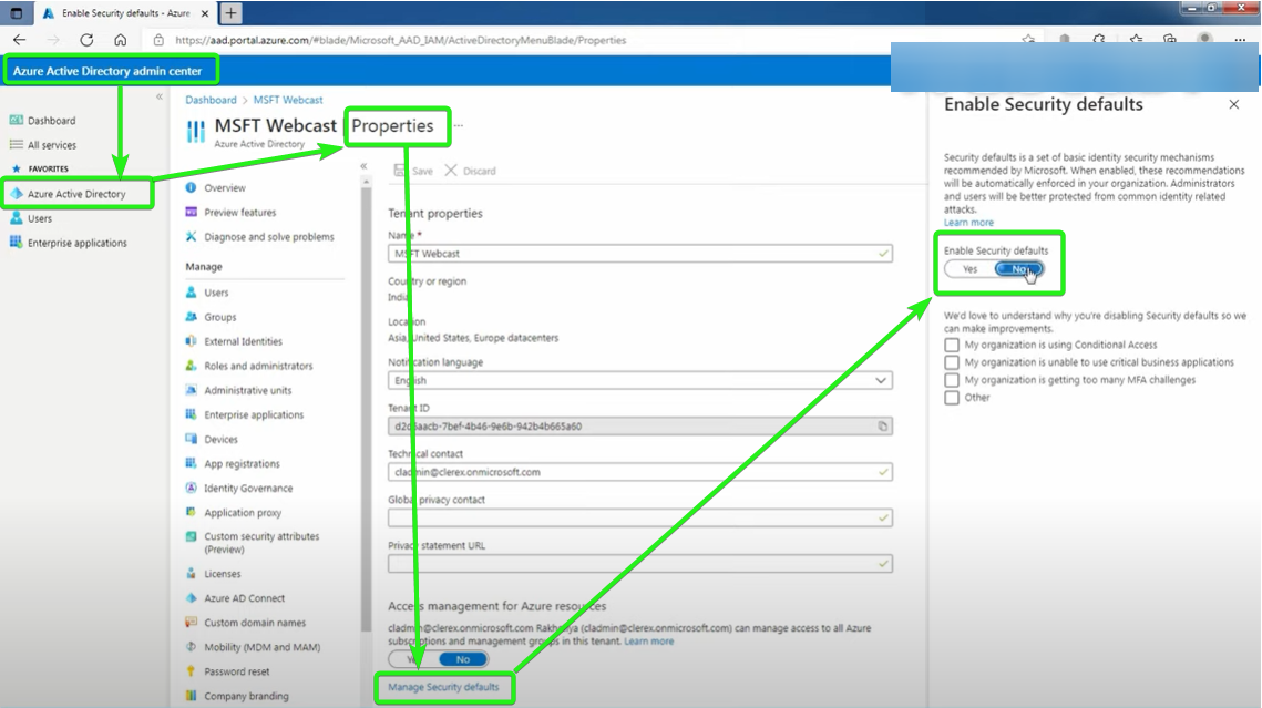 Ga in Azure naar Dashboard / Azure Active Directory / Properties, kies daar Manage Security defaults en zet Enable Security defaults op NO |