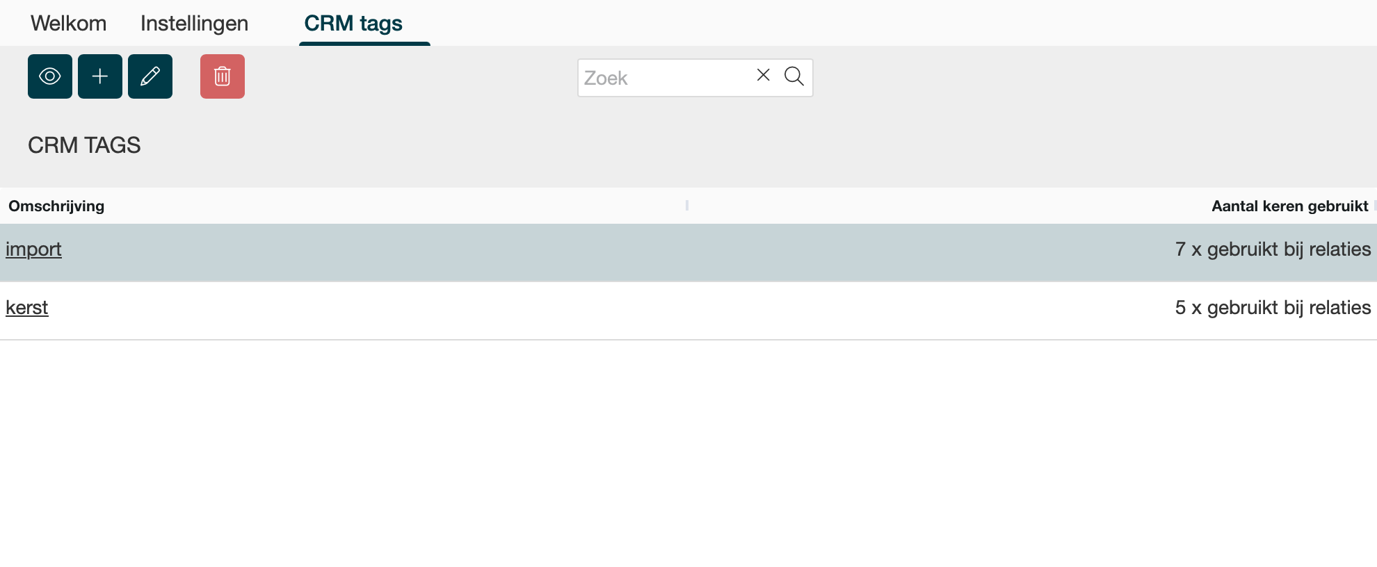 Via Instellingen → Beheer → Relaties → CRM Tags zie je het CRM tags overzicht. De CRM tags zijn zichtbaar wanneer je over de module CRM beschikt.