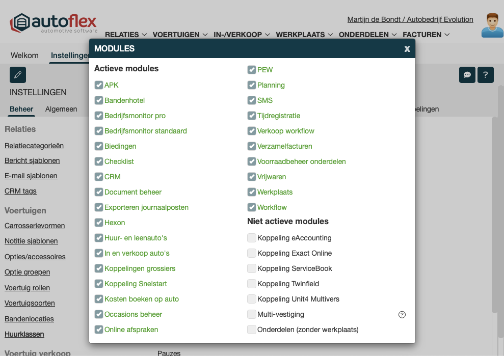 Autoflex 10 is een modulair systeem waar bij het basis-systeem uitgebreid kan worden met één of meerdere modules. Via het module dialoog in de beheer tab kun je direct zien welke modules actief zijn.