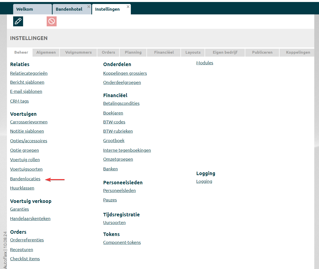 Klik bij Bandenhotel op het hamburger-menu en dan op bandenlocaties