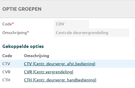 Bij een auto kan je bij tabblad opties de opties laten zien in een optie groep. Bij opties/accessoires kan je aangeven per optie bij welke optie groep het hoort. |