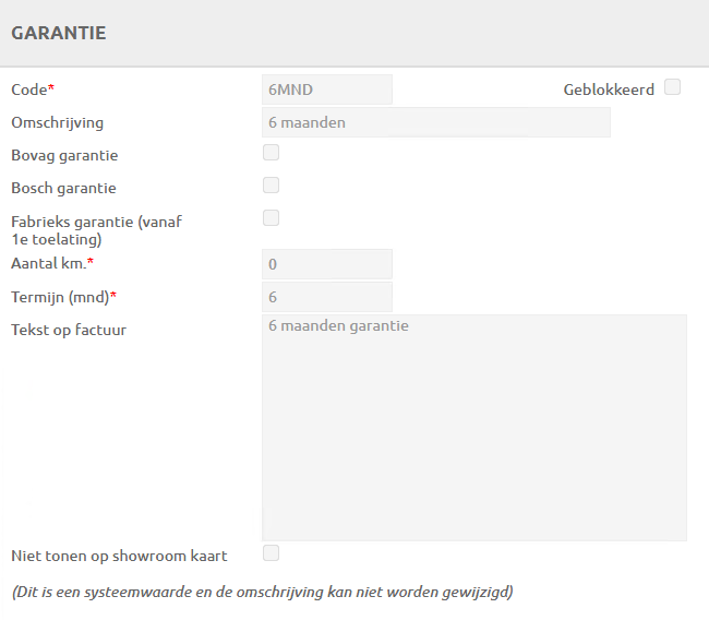 Garantie soorten en teksten kan je zelf aanpassen via het menu: Instellingen / (tabblad) beheer / Voertuig verkoop: Garanties. |