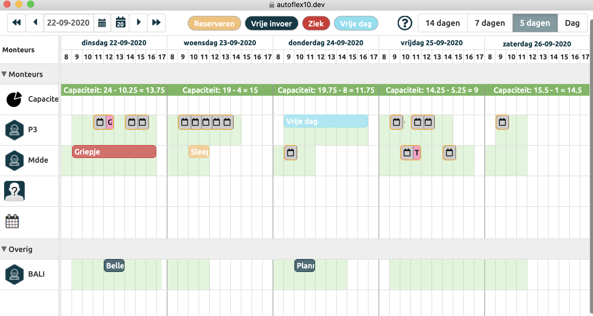 Planning met capaciteit De capaciteit balk toont: beschikbare tijd - gewerkte tijd = capaciteit |