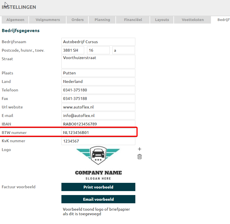 Pas het BTW nummer in je Autoflex aan bij de Instellingen → Bedrijf |